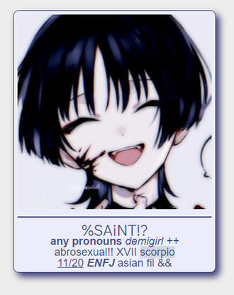 my name is saint. i go by any pronouns, including neopronouns. i am a demigirl who's an abrosexual. i'm a minor— 16 years old. i am a scorpio born in november 20, 2005. my mbti is ENFJ and im an asian filipino.