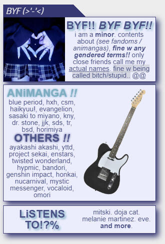 before you follow, i am a minor and content about (see anime and mangas + others). i'm fine with any gendered terms. only close friends call me my actual names (nami/mafu)! call me insult name, idc whether it's a joke or not. as long as you let me call you insult names too (as a joke or not).