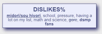 i dislike midori/sou hiyori from your turn to die, school, pressure, having a lot on my list, math and science, gore, dsmp fans.