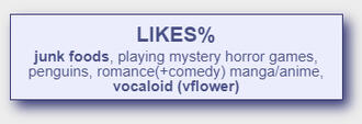 i like junk foods, playing mystery horror games, penguins, romance (or romcom) anime/mangas, and vocaloid (esp vflower!)