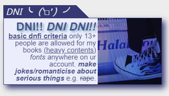 do not follow/interact if basic dnfi criteria (click this!), people under 13. only 13+ people are allowed for my books due to heavy contents. fonts anywhere on your account. makes jokes/romanticise about serious things (e.g. rape, abuse).